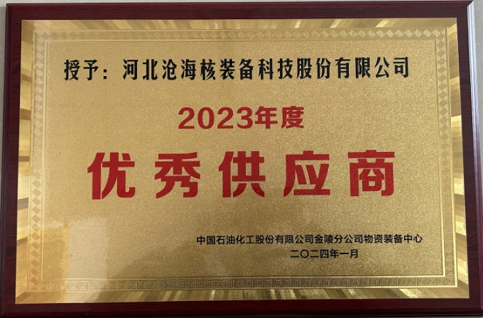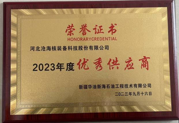 近日,河北滄海核裝備科技股份有限公司先后榮獲2023年度中國石油化工股份有限公司金陵分公司物資裝備中心、新疆華油新海石油工程技術有限公司頒發的“優 秀供應商”榮譽稱號,為公司榮譽墻再添新彩。
