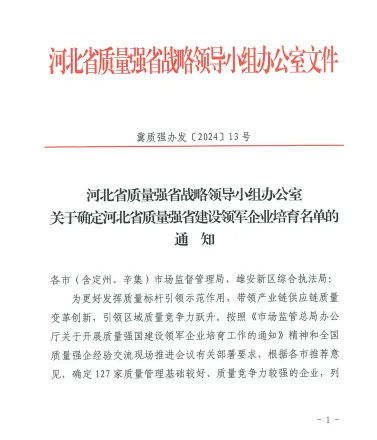 該資質旨在更 好發揮質量標桿引 領示范作用,帶領產業鏈供應鏈質量變革創新,引 領區域質量競爭力躍升。入圍該名單標志著公司質量管理基礎較好,質量競爭力較強,在開展質量分析、實施標桿管理,不斷追求卓 越等方面優先獲得資源支持,助力企業不斷提高質量管理水平和質量競爭力。